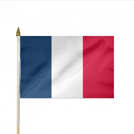 Drapeau France à agiter en tissu, collé sur hampe en bois de 63cm.
